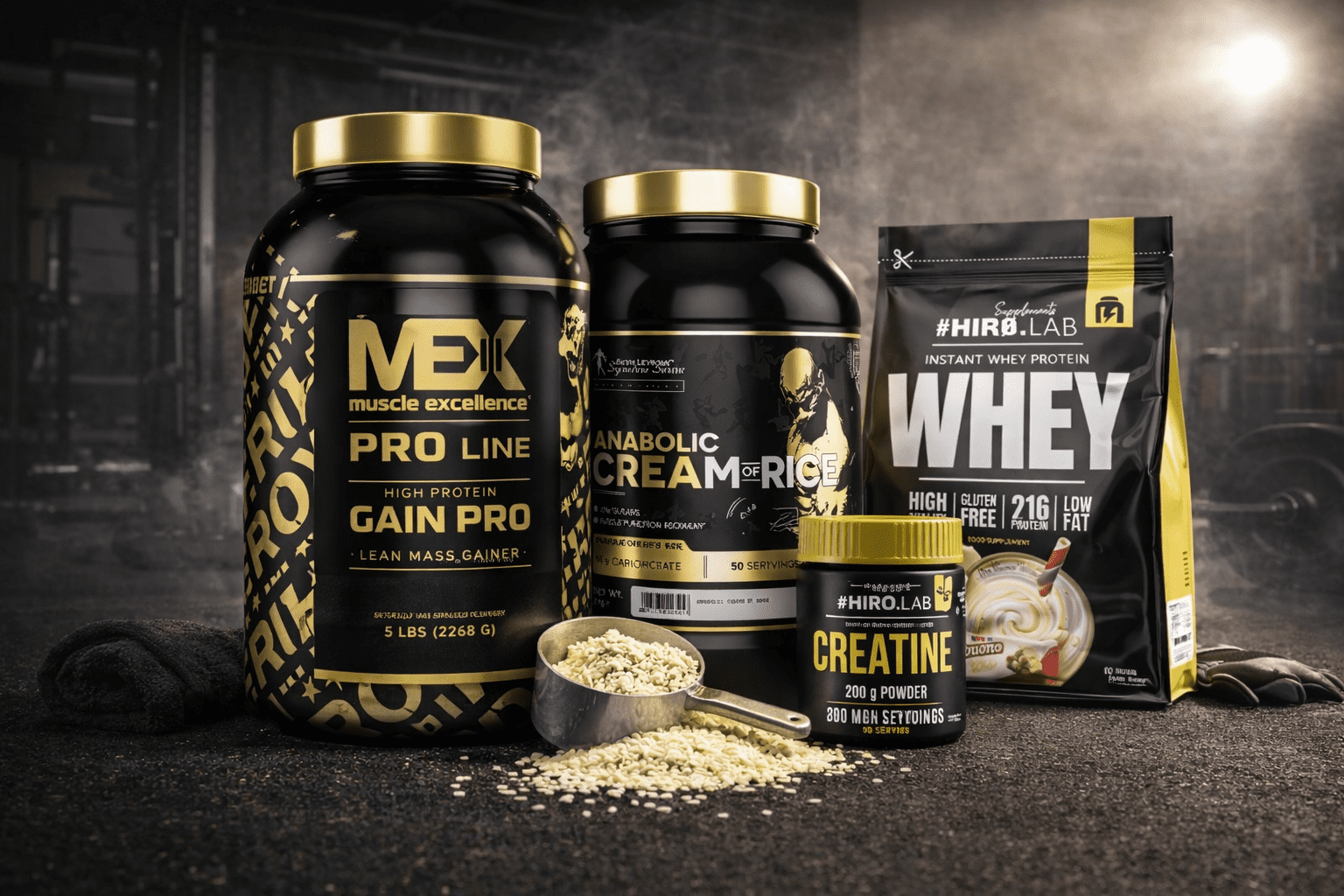 Dans un shaker: 1dose de gainer + 1dose de whey + 50 à 80g de crème de riz + 3 à 5 g de créatine (1 fois par jour seulement) le tout avecvde l'eau ou due lait